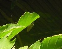 この写真は、ビューンと飛んでいった先を目で追って、 隠れるように葉裏に静止した所を一枚。