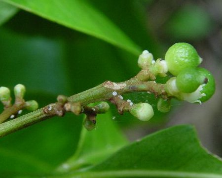 ハナシンボウギの花、実付近に産み付けられたヒメウラボシシジミの卵。