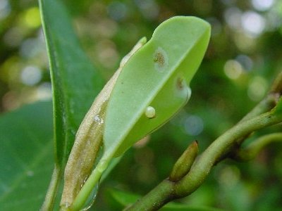 アギンダの有名ポイントに生えるタイワンオガタマノキにコモンタイマイの卵が3個ついていた。