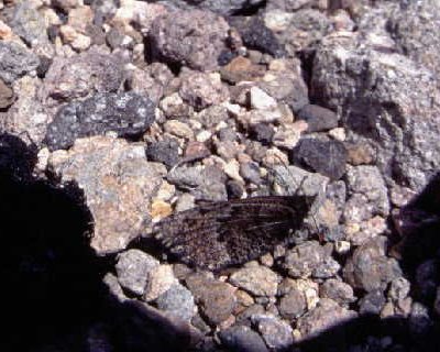 はねを閉じたまま傾けて止まる蝶を初めて見ました。 写真のような吹きさらしの礫地にいるので風を避けるためと考えられている。 私の個人的見解では身を隠すためでもあると思う。 小さいし色は背景とあまり違わないし、ぺたっとはねを傾けて張り付くと見つけにくいこと最上級です。 写真のどこにいるか分からないでしょう? 下のちょっと茶っぽい三角の固まりがそれです。 結構敏感なので近づきにくかったです。これも天然記念物。 |