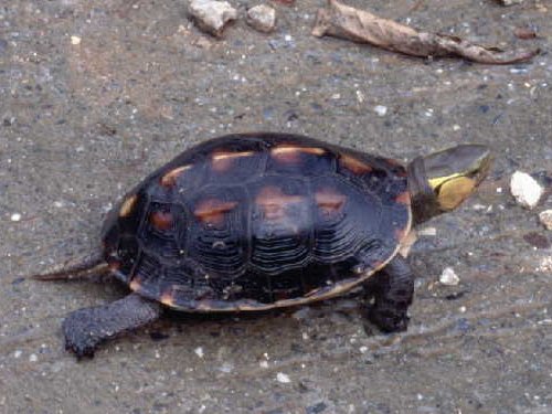 西表島の祖納の部落で採集していると、スコールが。 熱帯のスコールは雨の境目がはっきり見える。 雨が木々を打つザーと言う音がゆっくり向こうから近づいて来た。 雨が小降りになると、どこからともなく亀が1匹、もう1匹と道に出てきた。 きっと雨に誘われたのだろう。 この亀はセマルハコガメ、天然記念物である。 普通の亀とどこが違うかというと、胸の側の甲羅にちょうつがいのような部分があって、そこを閉じると首を出す穴さえ隠れて、名前の通り箱になってしまうのだ。 |