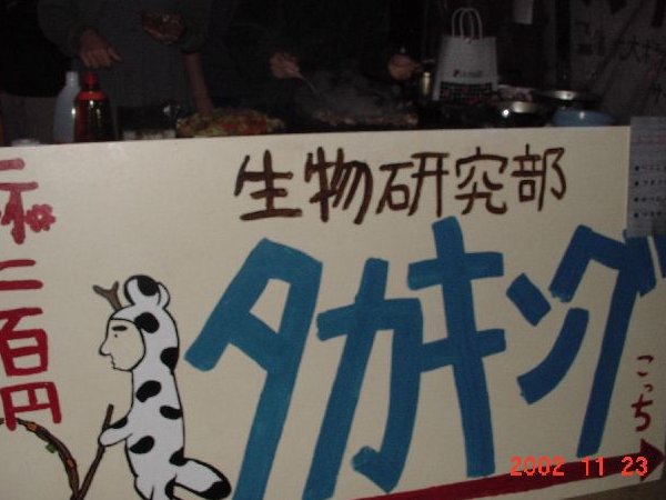 勉強に関することは忘却のかなたに。 展示室を見つけ中に入ると、そこでMACを発見。 山口のギフで会った後輩だ。 ちょっと言葉を交わし、2回生のゾウムシやに標本を案内してもらう。 私には全然わからないが、これは好いんですよと一匹の虫に。 思い入れは今も昔も変わらず、些細なことから虫にはまっていくものである。 甲虫屋さんがほとんどで、蝶はS⇔Rのみ。 もう一人水生昆虫屋のおいかわ丸に初対面。 「おいかわ丸のくろむし屋」の管理人で5回生。 このHPは面白いのでお薦めである。 このOBの部屋も時々のぞいているらしい。 展示室内ででVITAEを購入。 328ページの力作であった。 S⇔Rに伝統の焼き蕎麦屋に連れて行ってもらう。 私の時はピロティでやっていたが今は運動場の中に。 屋台の数、規模も縮小したのか? 焼き続けて髪の毛が焼きそばになった事を思い出す。 何もかもが懐かしい・・・。 味の方は薄味、もうちょっとソースを使った方が宜しいと思うが、それはそれ、予算の都合もあるのだろうからご愛嬌。 若者がいっぱい、昔と基本的精神は変わらず。 会社に入ると制約が多くなるから力いっぱい今を楽しんでねと思いながら会場を後にした。 |
